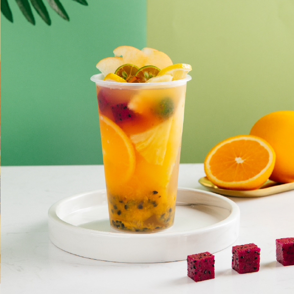 晶花茉莉花茶水、佳芝味甘蔗糖浆、橙子片、柠檬片、百香果酱、热水、苹果片、凤梨块