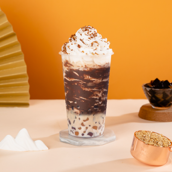 艿大师燕麦艿、金猫冷萃咖啡、佳芝味甘蔗糖浆、巧克力酱、晶花咖啡冻、芋圆、淡奶油雪顶、巧克力碎